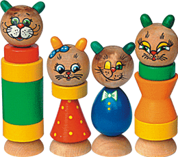 Эти четыре пирамидки для самых маленьких, можно использовать в комплекте и разыгрывать сказку «Кошкин дом», или сюжеты из жизни благополучной кошачьей семьи, или использовать как конструктор. Не случайно герои пирамидки - кошки и котики, они с самого раннего детства привлекают внимание ребенка, хорошо знакомы ( у многих есть дома), слово-звукоподражание "МЯУ" легко дается самым маленьким. Игры с пирамидками развивают моторику, а значит, это доказано учеными, и речь. Ребенок знакомится с формой (цилиндр,конус,кольцо, катушка,шар), может самостоятельно составлять «наряд» и переодевать всю семью. Кошачья семья поможет закрепить понятия выше-ниже, справа-слева,спереди-сзади.