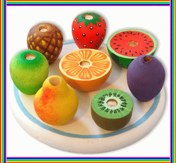 На восемь штырьков нужно надеть восемь деревянных фруктов: арбуз, ананас, клубника, груша, яблоко, слива, киви, апельсин....